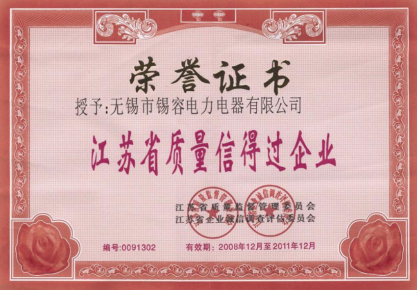 2008年江蘇省質量監(jiān)督管理委員會、江蘇省企業誠信調查評估委員會,授予無錫市錫容電力電器有限公司 “江蘇省信得過企業”榮譽證書